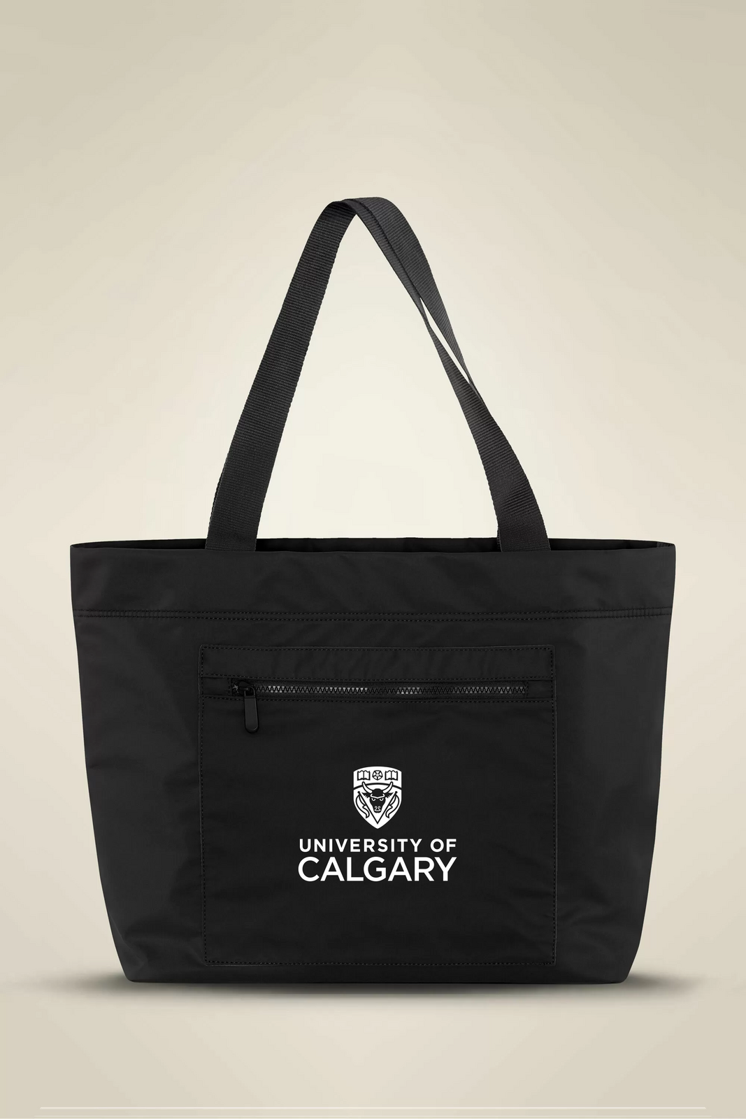 Designed for anything, from University days to weekend getaways. Spacious with a smooth matte finish, this tote is as versatile as it is elegant; ready to carry you through every part of your day. University of Calgary Coat of Arms logo on the front pocket.