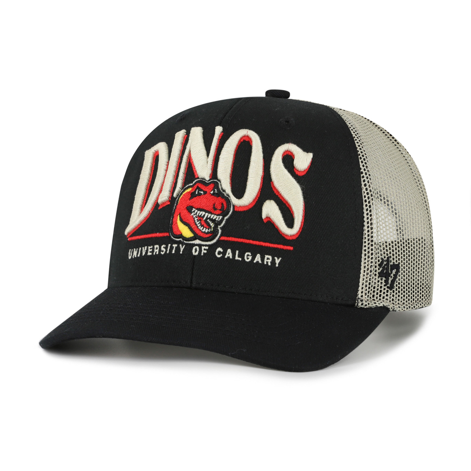 The '47 Trucker has a comfortable mid-crown, a curved visor, and an adjustable plastic snapback. Made from garment washed cotton twill and hard mesh. Decorated with Dinos University of Calgary patch on front.