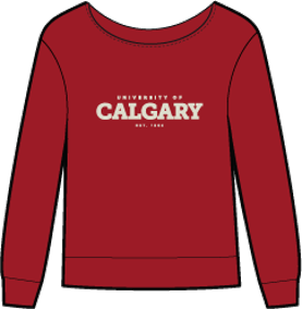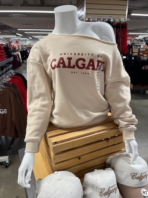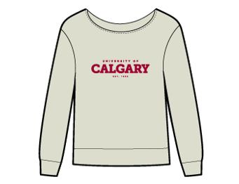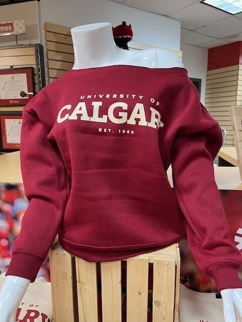 Long sleeve slouchy sweater can be worn off the shoulder. Made from 75/25% poly/cotton. Decorated with University of Calgary on the front.