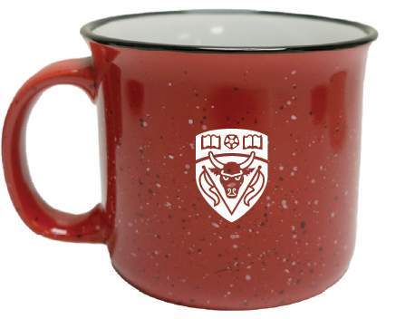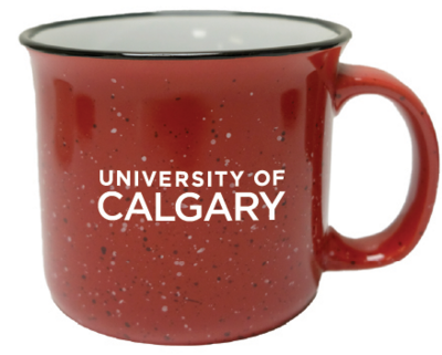 - Ceramic mug with a speckled exterior, glossy finish, and top black rim