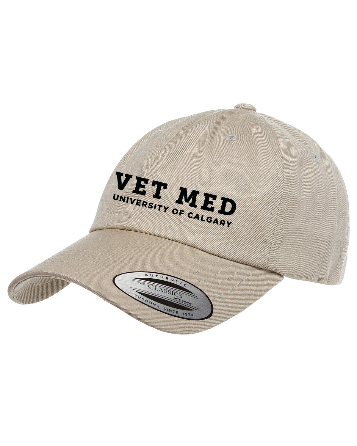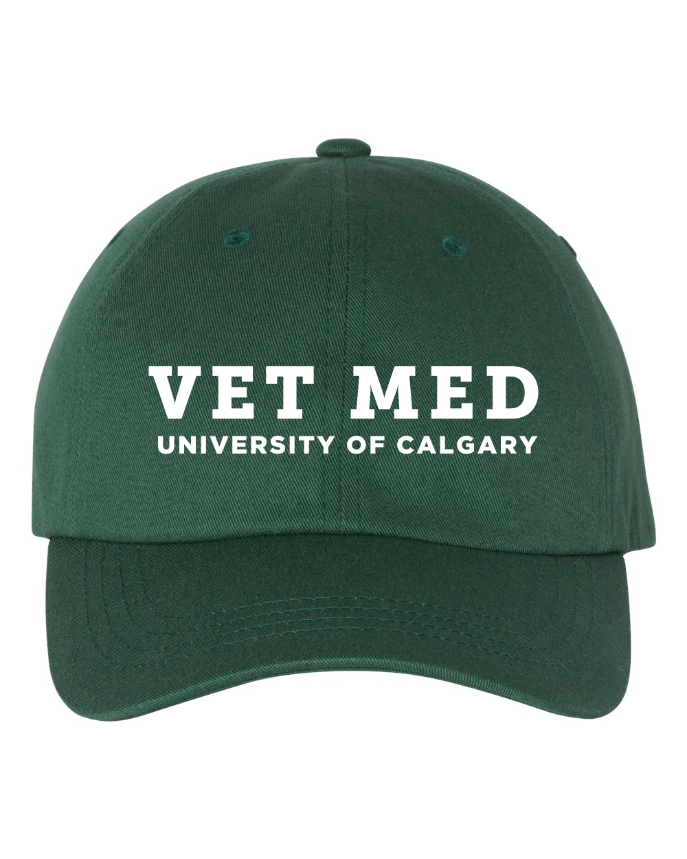 6 panel, low profile, unstructured hat features 4 rows of stitching on visor, 3-1/8" crown, matching under visor and antique brass buckle closure. Embroidered with VET MED University of Calgary on the front.