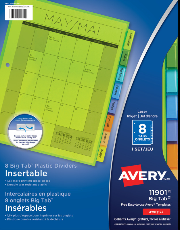 Easy to customize with free templates and designs using Avery:® Design & Print Online Software 1.5x more printing space on tabs lets you use large fonts or more lines of text than on typical inserts Durable, flexible PVC-free plastic dividers Unique tab design allows easy access and prevents inserts from falling out Assorted translucent colours stand out to help you find the right section quickly